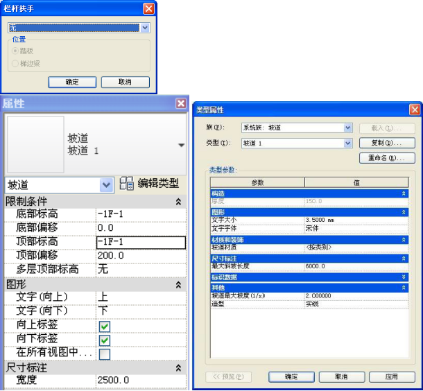 l 打开坡道“类型属性”对话框,设置参数“最大斜坡长度”为“6000” “坡道最大坡度(1/X)”为“2”、