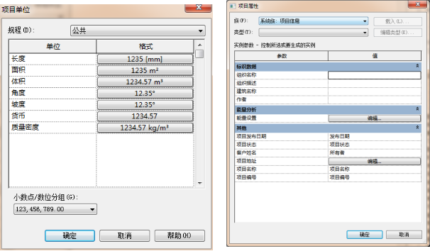 单击“管理”选项卡—“设置”面板—“项目信息”选项,打开如图 1.2-1 所示的实例属性对话框,输入项目信 息。 使用“项目设置”面板—命令,打开“项目单位”设置对话框,如下图左图所示。