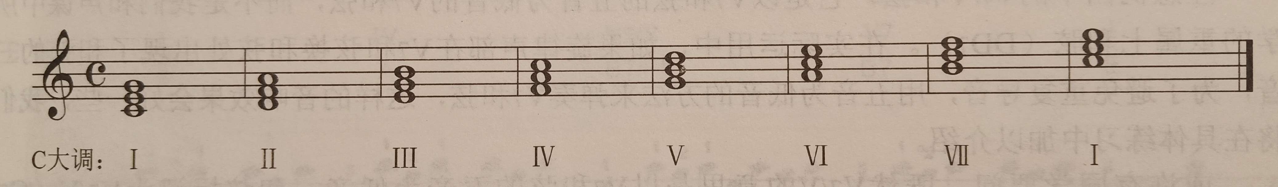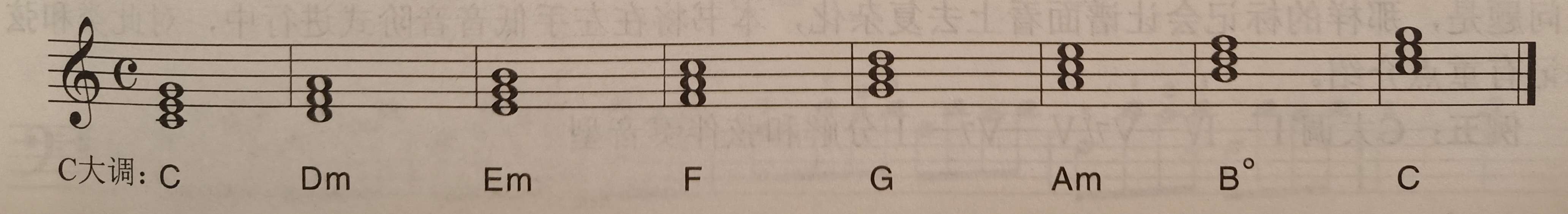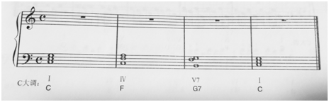 注:大调正三和弦、属七和弦五音旋律位置的和弦连接,是指在大调主和弦I级和弦旋律位置是主和弦五音的情况下,按照和声连接法,即共同音保留在同一声部的方法,进行正三和弦、属七和弦Ⅰ-Ⅴ-Ⅴ7的基本和弦连接。