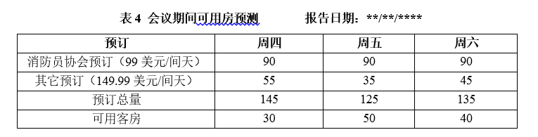 Poco是H 酒店的收益经理,Mark是前厅经理,Latisha是销售与营销总监。他们三个都是酒店收益管理委员会的成员。酒店拥有175间可用客房。下个月酒店将接待退休消防员协会的团队入住。协会起初以99美元/间天的价格预定了周四、周五、周六三晚的客房各90间,现在这些客房已经成为酒店的新增预订了。当前三天会议期间酒店可用客房预测情况如下表所示: