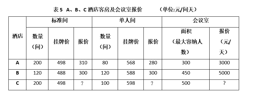 某市有三家同类型的中档酒店A、B、C,它们的主要房型和会议室数量如表1所示。对该市的酒店经营者而言,6月、7月、8月三个月往往是淡季,平均出租率不足30%。较旺季(3月、4月、5月和10月、11月、12月)平均出租率80%而言,这三个月的出租率低出很多。但刚刚有一个重大的利好消息传来:某省直机关将在两个月后(即6月中旬)在该市举办一场为期四天的大型会议,参会人数预计超过400人,需要标准间180间、单人间40间。为例接下这单生意,A、B两家酒店的销售部门均向会议组织者提交了具有竞争力的报价(见表5)。C酒店自然也不愿意放弃这次难得的机会,销售经理提出:A、B两家酒店的报价折扣力度很大,为了确保拿下这一单,C酒店应该报出比A、B两家酒店更低的价格。