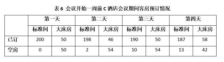 (4)在距离会议开始一周时,主办方提出需增加10间标准客房,并表示愿意以400元/间天的价格支付这10间房的房费。几乎与此同时,饭店预订部门接到一个预订会议第二天到第三天的2个标准间的请求。此时,会议期间的预订情况如表6所示。C饭店能够接受会议举办方的新增预订吗?是否接受会议第二天到第三天的2个标准间的电话预订请求呢?