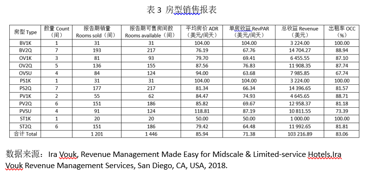 下表是一家拥有47间客房的有限服务酒店上个月的房型销售报表。请仔细阅读表格内容,回答下面的问题。