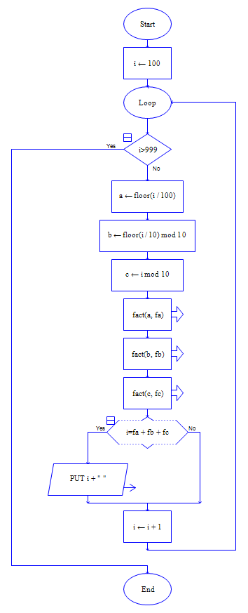 有这样一个3位数,组成它的3个数字阶乘之和正好等于它的本身。即:abc=a!+b!+c!,请你用递归法搜索一下这样的3位数。
