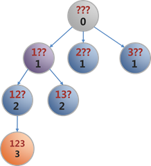 (3)填上2后,又到了下层一个节点,该节点的状态m=2,再扩展下去,第三位只能填3,于是到了最下面的黄色节点。
