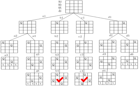 在一个N*N的棋盘上放置N个皇后,且使得每两个之间不能互相攻击,也就是使得每两个不在同一行,同一列和同一斜角线上。以n=4为例。