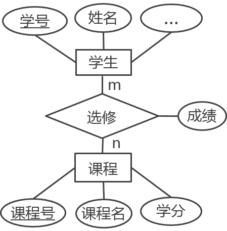 E-R模型的基本元素包括实体(用矩形表示)、属性(用椭圆形表示)、联系(用菱形表示)。实体之间的联系分为一对一(1:1表示)、一对多(1:n表示)和多对多(m:n表示)三种。在E-R图中,加下划线的属性(或属性组)表示实体的码。如图,学生和课程之间是多对多的联系。