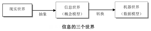将现实世界中的事物抽象,存入数据库中,共有三个世界、两种模型。三个世界是指:现实世界、信息世界、机器世界,而两个模型就是上面所说的概念模型和数据模型。
