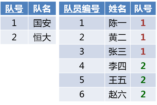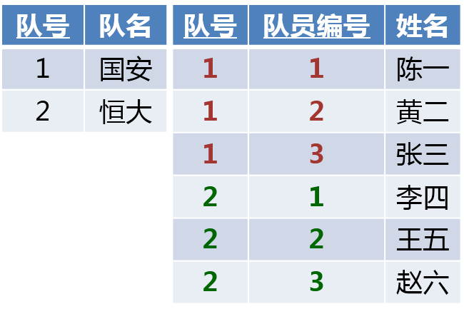 如果用外键法拆分,就形成了下表。看出什么问题了吗?将原表拆分为两张表,一张球队表,一张球员表。球队表和球员表构成一对多关系,并将一的关键字放到多的关系中,形成外键。对于球员表来说,1球队的球员编号是正确的,1号球队的1号队员,1号球队的2号队员,...,到了2号球队就不正确了,2号球队的球员编号则从4开始了编号了,这显然和我们常规球员出场介绍方式有悖。我们期望介绍的时候是1号球队的1号队员,1号球队的2号队员,...,2号球队的1号队员,2号球队的2号队员,...,这种方式。
