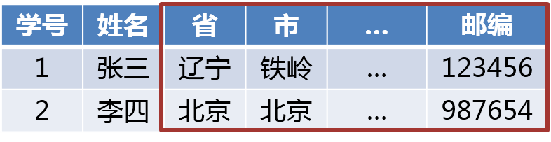 所谓第一范式(1NF)是指数据库表的每一列都是不可分割的基本数据项,同一列中不能有多个值,即实体中的某个属性不能有多个值或者不能有重复的属性。简而言之,第一范式就是无表中有表的形式。比如下表中,通讯地址列就出现了多个值(省、市、...、邮编)。