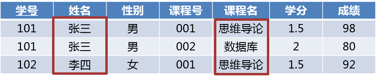 如果课程信息发生变动,比如思维导论课程名称发生变化,则必须将课程名称列中所有课程名称为思维导论的都需要修改,如果漏改一个,则会出现更新异常。