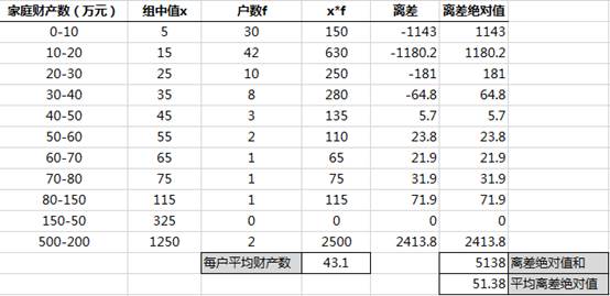例题3:分组平均差。家庭财产统计有如下表格,求平均财产和平均差。