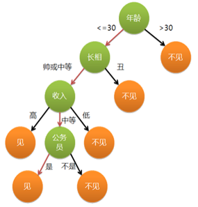 这个女孩的决策过程就是典型的分类树决策。相当于通过年龄、长相、收入和是否公务员对将男人分为两个类别:见和不见。假设这个女孩对男人的要求是:30岁以下、长相中等以上并且是高收入者或中等以上收入的公务员,那么这个可以用下图表示女孩的决策逻辑。