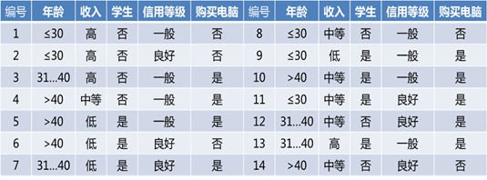 例题1:下表数据是取自AllElectrionics顾客数据库数据记录训练集,类标号属性购买电脑顾客数据记录训练集有两个不同的类(是,否),因此由此形成了训练样本的两个类,在训练集中有14个样本,两个类中分别有9个和5个样本。