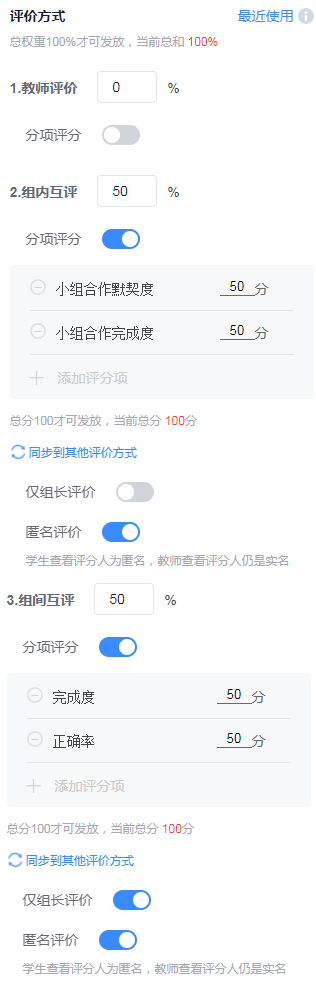 (1)项目采用同伴学习法,开启组内成员互评(匿名)和组间成员互评(组长评、匿名)方式。