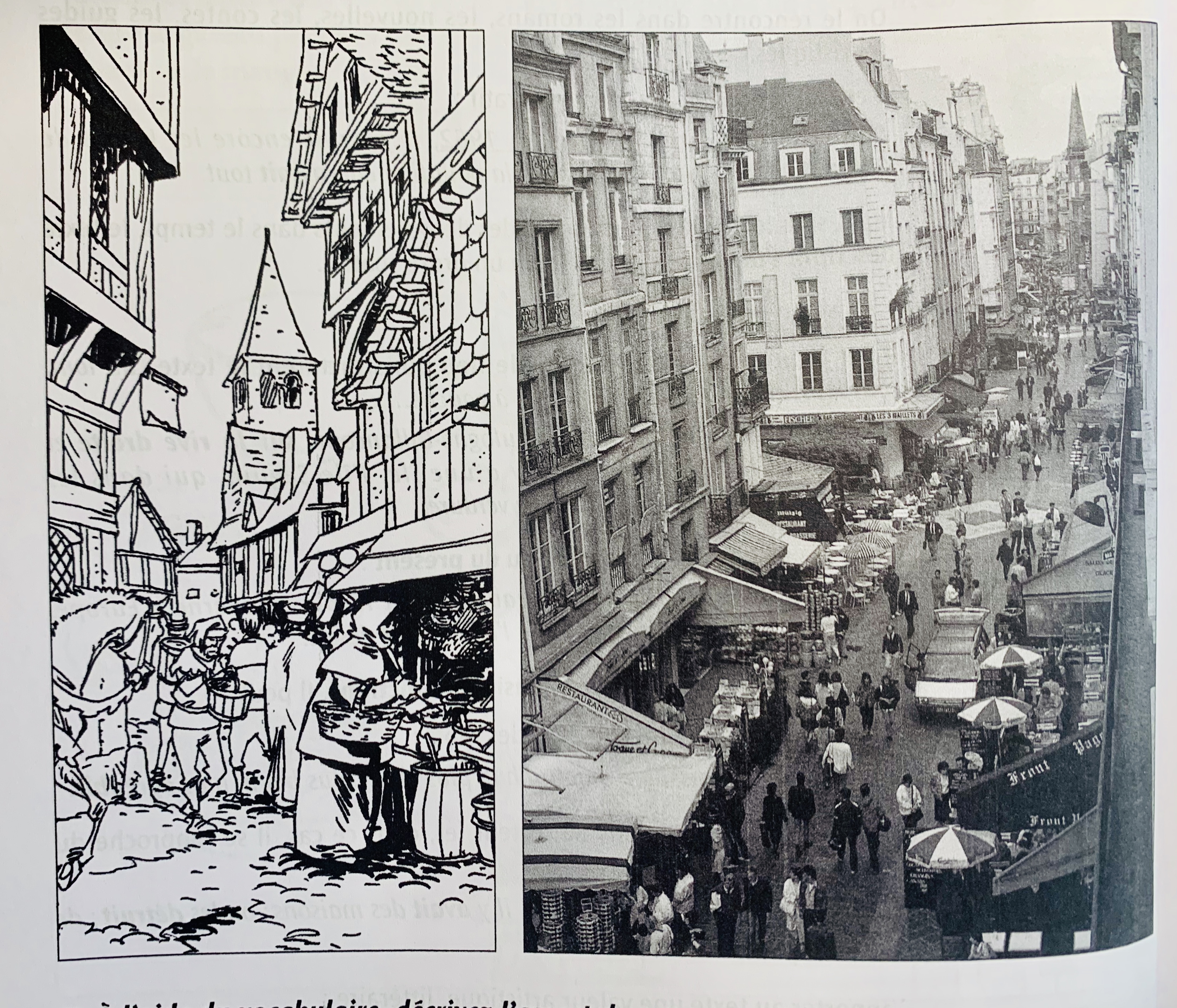 Pour décrire la rue médiévale à gauche : des pavés, encombré...