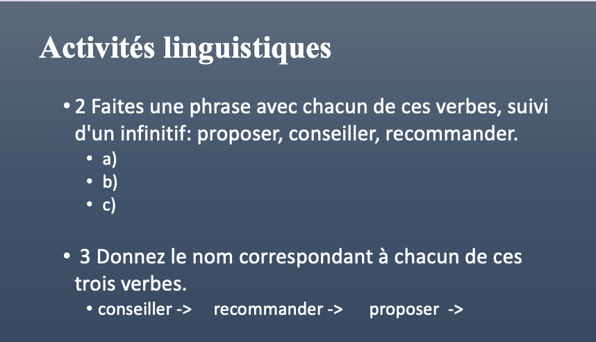 - Les verbes proposer, conseiller, recommander... 动词proposer, conseiller, recommander...