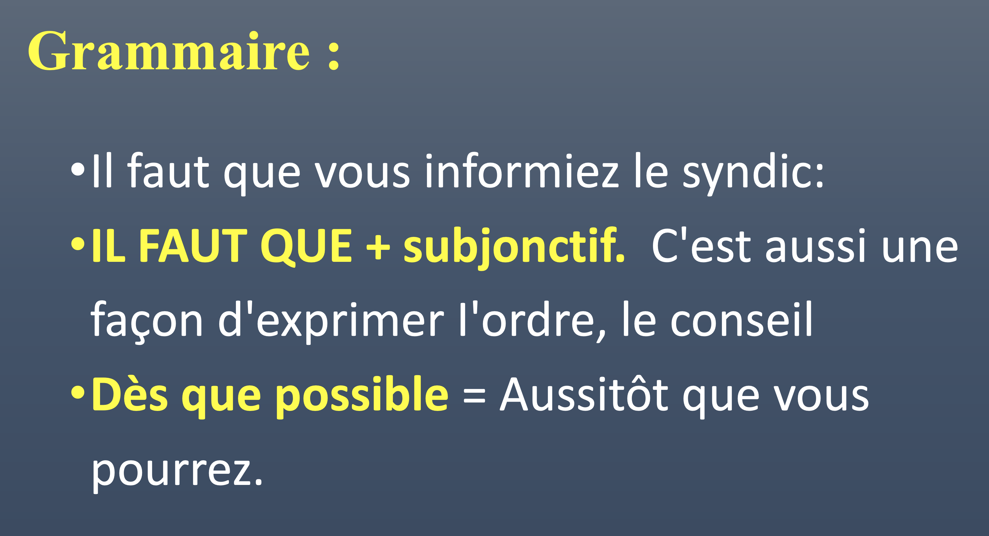 - Il faut que + subjonctif qui expriment l'injonction, l'ordre et le conseil 虚拟式表示指令、命令和建议