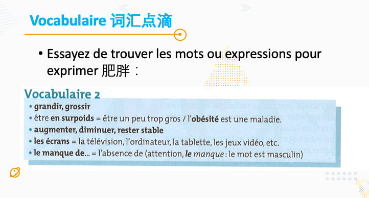 - facteurs de risque familiaux, mauvaises habitudes alimentaires, pas assez d'activité physique, temps passé devant des écrans