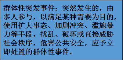 应急事件处置:公平分配社会资源,充分关照弱势群体,积极化解社会矛盾,完善信访制度,及时沟通信息,准确界定群体事件性质,启动应急规制。建立完善社会监控与预警机制。