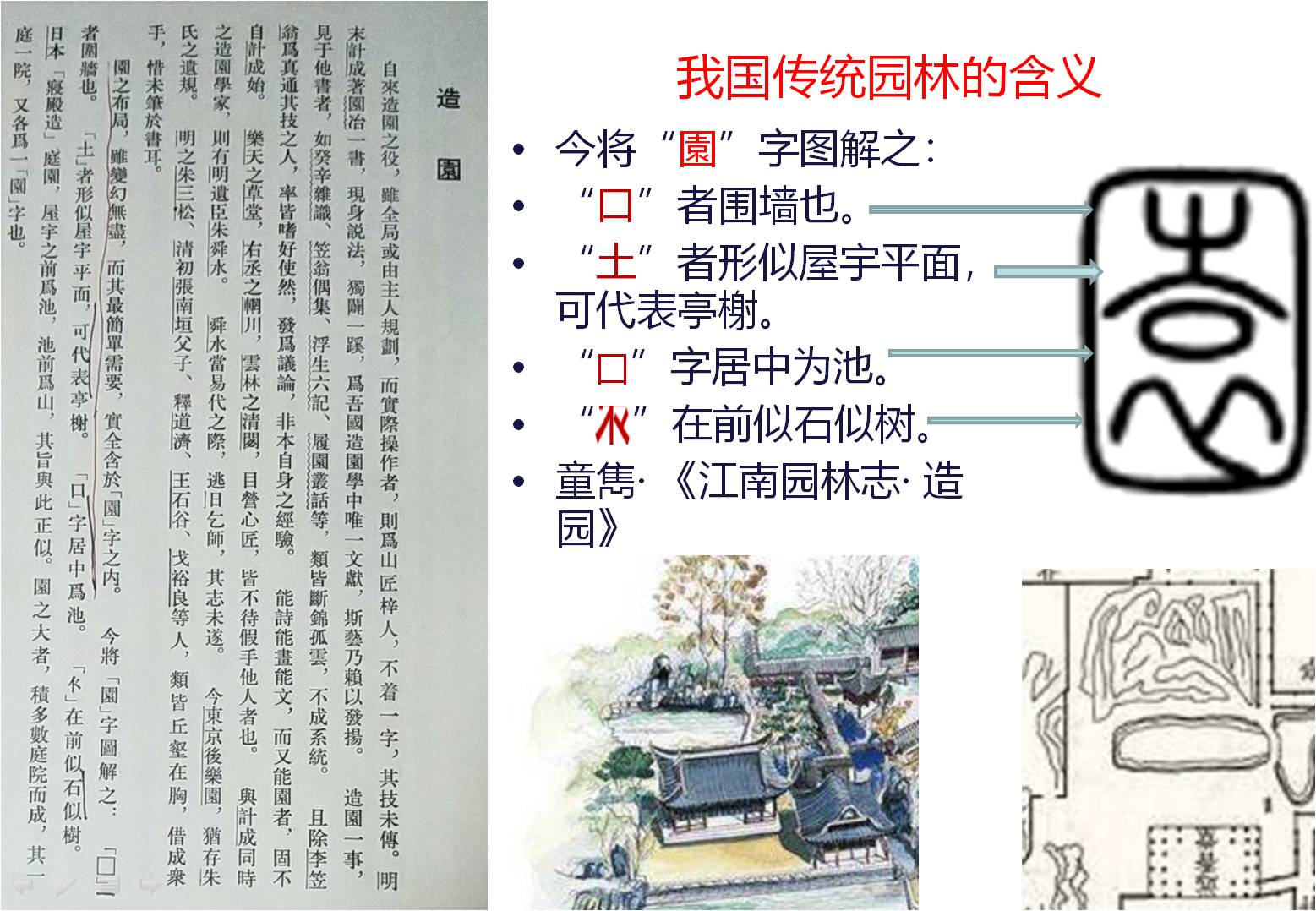 故最初的园、林、囿、圃、苑的涵义:是一块被围合起来用地,其间种植花草树木、圈养禽兽,以满足某些用途。