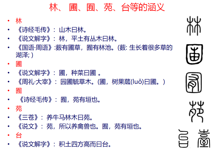 •1、我国古代•(1)皇家园林:囿、苑、台、园、圃等。例:上林苑;颐和园等•(2)《说文解字》:苑,所以养禽兽囿也。囿,苑有垣也。园,所以树果也。 •(3)《周礼·大宰》:园圃毓草木。•(4)私人园林:山庄、草堂、池馆、园居、别业、别墅(Villa)等