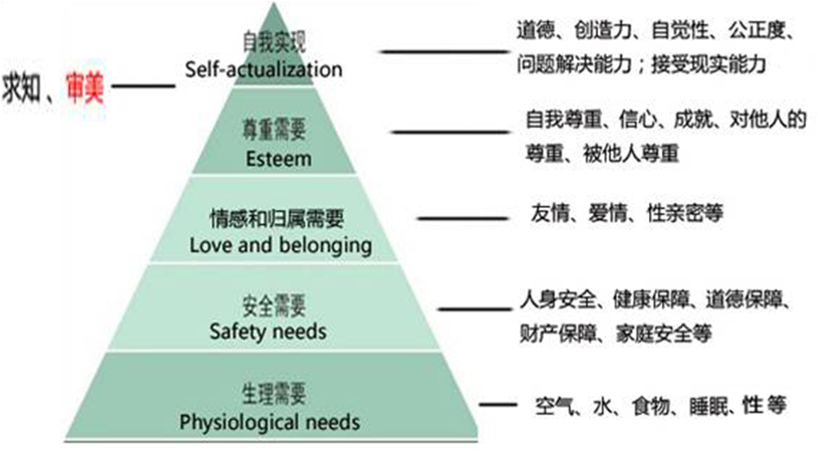 美国著名社会心理学家亚伯拉罕·马斯洛1943年提出心理需求层次理论,认为审美需求位于第四和第五层次之间。