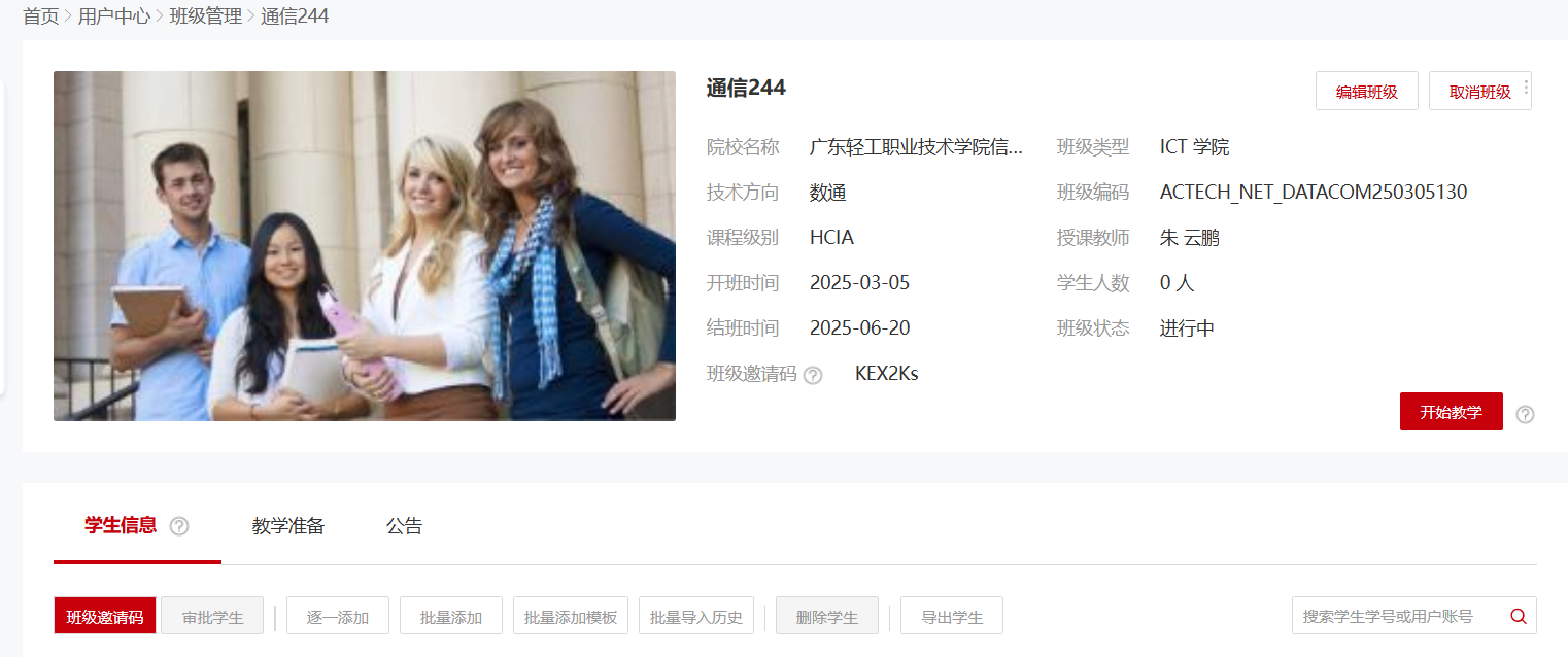 对于未关联本学院的用户,无论班级设置为是否审批,均需教师在班级详情页的学生信息栏进行逐个审批(无法批量审批)。一旦教师审批通过,则用户加入班级的同时也加入了学院。