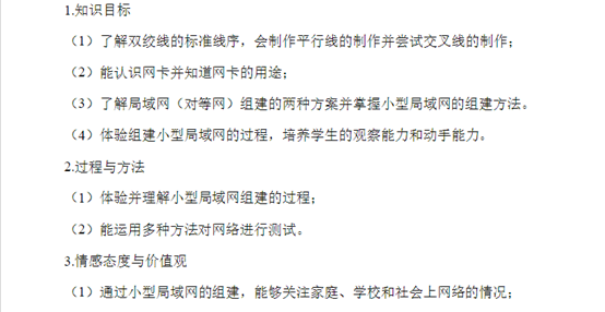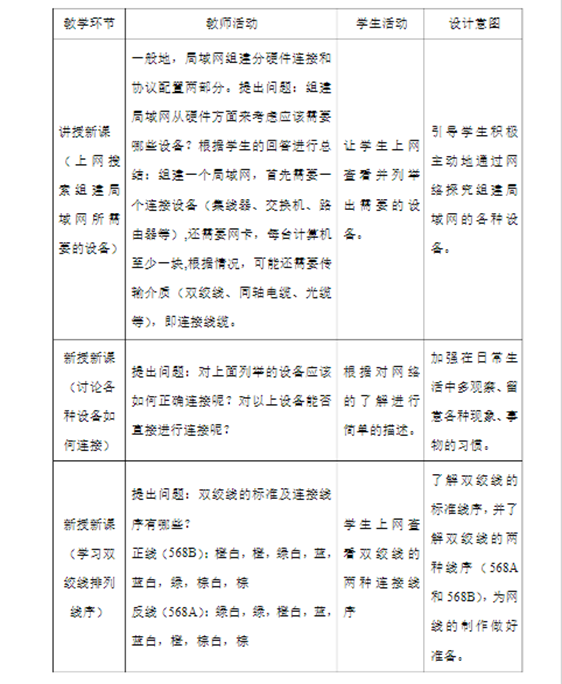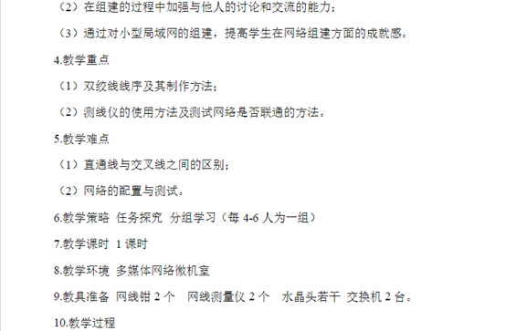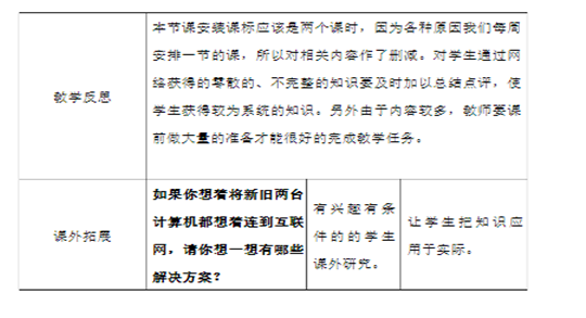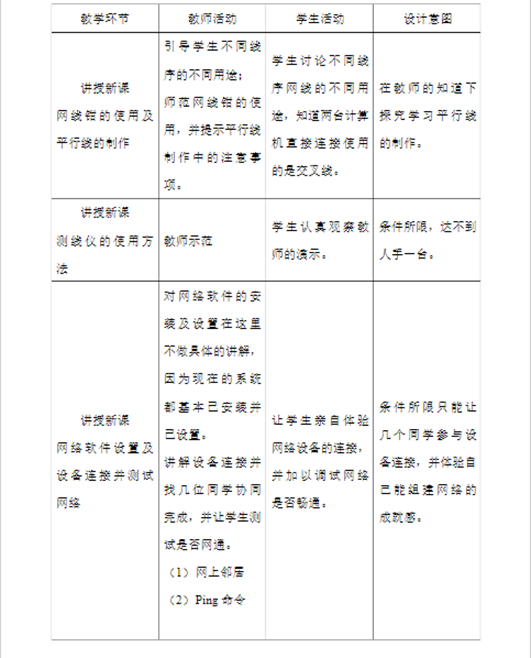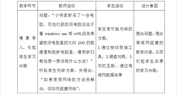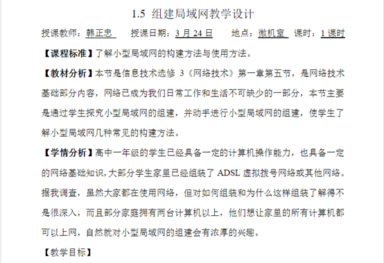 该教学设计来自网络https://wenku.baidu.com/view/6c4 e0df2680203d8 cf2f2421.html,是韩正中的一篇关于组建局域网的教学设计。虽然他的教授对象是高一年级,但讲授的对等网的建立这部分内容是非常值得我们借鉴的。