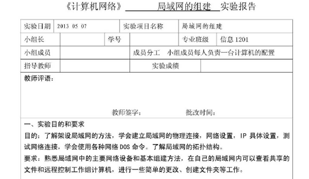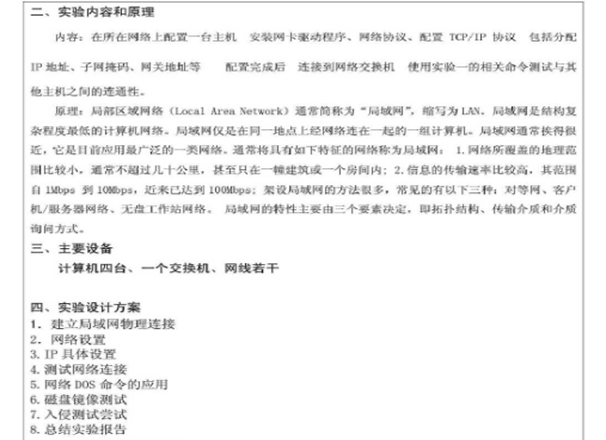 该实验报告来自http://wenku.it168.com/d_001625252.shtml,是大学计算机网络课程中的一个实验。此实验报告以学会网络搭建的物理连、网络设置、测试网络连接等为目的,全面展示搭建局域网的基本流程。