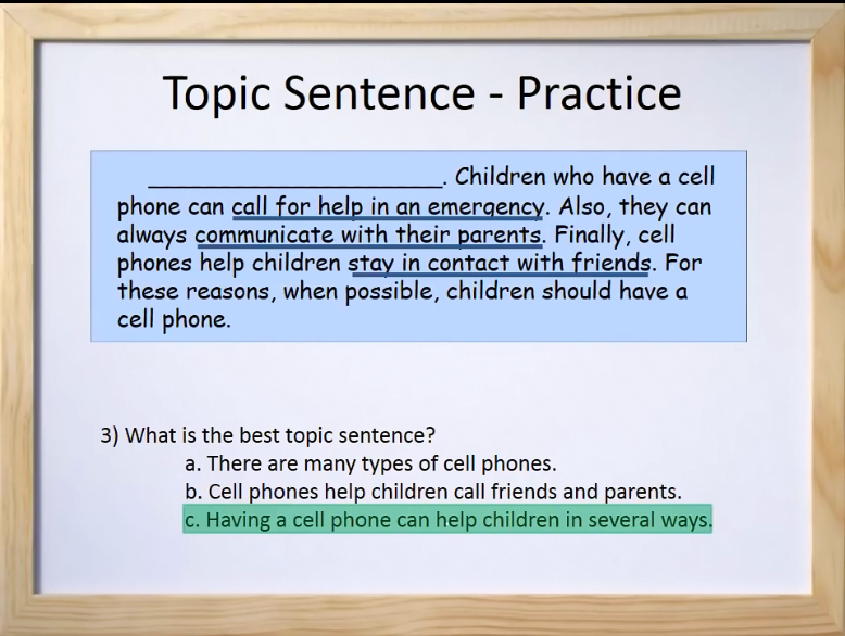 视频详细讲解了英文写作中段落主题句的撰写方法,并提供了多个主题句练习题。