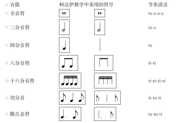 (3)柯达伊节奏读谱:在柯达伊教学法中,每一种时值的音符都会用与其对应的一种音节来读谱,这是在17世纪雅克·谢伟所创造的节奏音节基础上改造发展而来的。它的突出功能表现在: