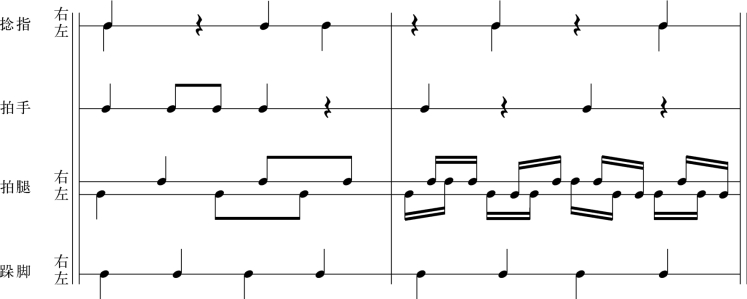 (4)声势的记谱方法:通常情况下,右手、右脚——符干朝上,左手、左脚——符干朝下。拍手只记在一行谱上,符干都是朝上;捻指、跺脚也都只记在一行谱上,符干朝上朝下分别表示右手右脚和左手左脚;而拍腿是记在双行谱上,分别表示左腿和右腿,符干朝上、朝下分别表示右手和左手,如下图: