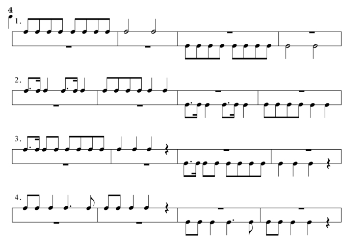 (1)站姿训练:谱例4(1~3)的节奏型。