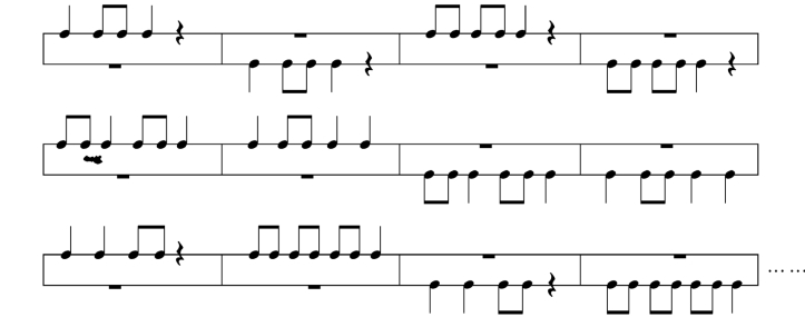 ●脚跟着地,前脚掌拍地:谱例4(1~3)的节奏型;