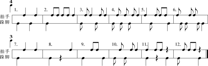 2.自主练习谱例4中(4~6)、(10~12)的节奏型,达到能协调地进行手、脚配合的声势活动。