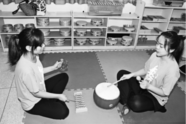 2.学生两人或三人或更多人一组,各自选取1~2件乐器,共同商量一个对话的小情景,并尝试运用打击乐器进行即兴的对话练习。