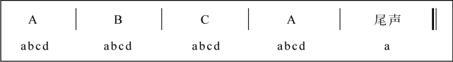 (3)分析乐曲的结构特点,把握动作组合结构:共有ABCA四段,按A到A的顺序进行一遍,最后结束在结束句上。每段皆由四个乐句组成,结构非常工整。
