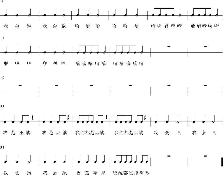 小结:这一课例主要参考了陈蓉的教学视频及陈蓉编著的大班《跟我摇摆》课程中有关《巫婆》的系列活动。通过学念咒语、学唱咒语歌、学做戏剧表演这三个环节的模仿学习和探索活动,我们学会了如何运用富于变化的嗓音、表情、动作等来表达音乐中音色的变化、旋律的高低、节奏的不同,进而体验音乐中的音响变化与人的情绪情感及动作表情的关系。为我们今后进一步学做表演奠定良好的基础。
