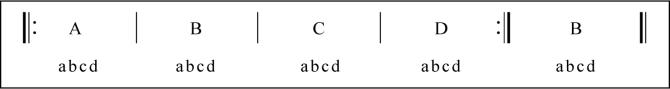 3.分析乐曲的结构特点:共有ABCD四段,按A到D的顺序重复一遍,最后再次重复B,并结束在B。每段皆由四个乐句组成,结构非常工整。