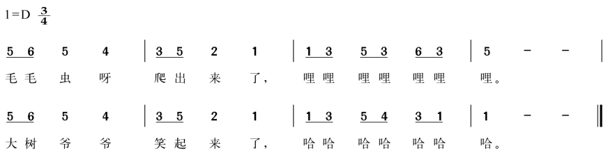 扮演“树枝树干”的学生围站在扮演“大树爷爷”的教师周围成一棵大树,扮“毛毛虫”的学生从“大树爷爷”和“树枝树干”之间爬出,在“树枝树干”和“大树爷爷”身上爬上爬下,发出“哩哩哩哩”的声音,然后扮演“树枝树干”和“大树爷爷”的师生浑身上下摇摆,发出“哈哈哈哈”的声音。