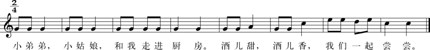 这是一首四小节一乐句,共八小节两乐句的小歌曲。全曲只用do、re、mi、sol、la五音,是一首五音调式的歌曲。