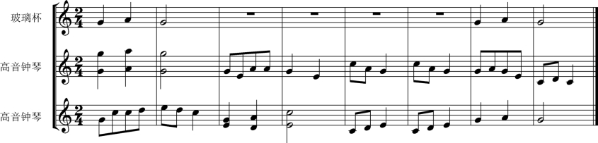 提示:由于玻璃杯琴声部只涉及sol、la、sol三音,可以将要演奏的三音的杯子单独拿出来排列演奏,以降低难度。敲击时可一人独奏,也可3人合作演奏。