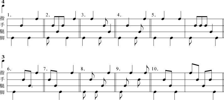 提示:拍腿可以单独作为钢琴、电子琴等键盘乐器演奏的准备练习,因为任何乐器的演奏(包括打击乐器)都要求双肩、双臂的支持与放松,故拍腿练习是器乐学习前很好的预备练习。