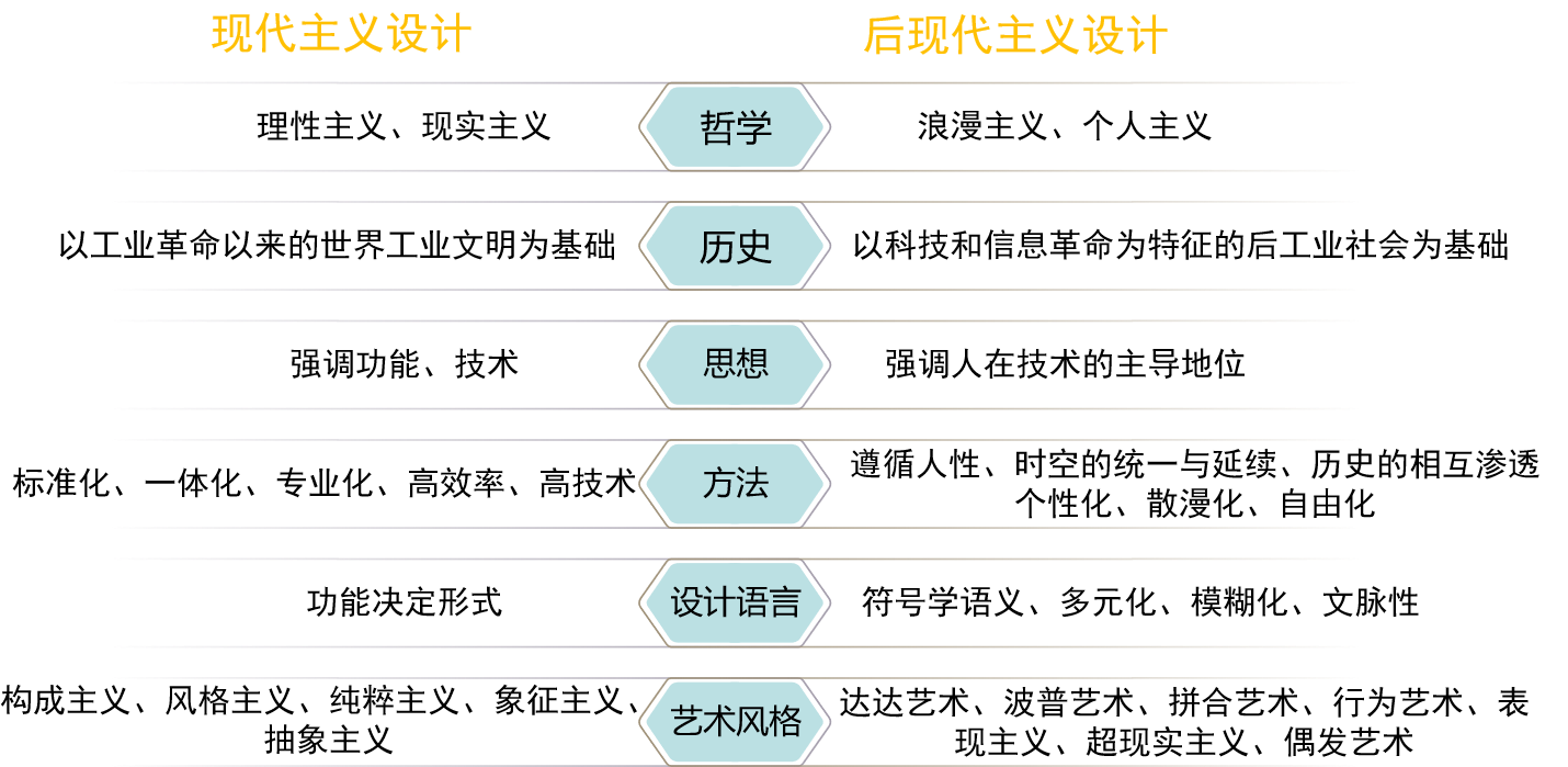 后现代主义(Post Modernism):是从建筑设计上发展起来的一个风格明确的设计运动,无论从观念上,还是从形式上,都是非常清晰的,而设计上的后现代主义运动则从80年代末开始出现。