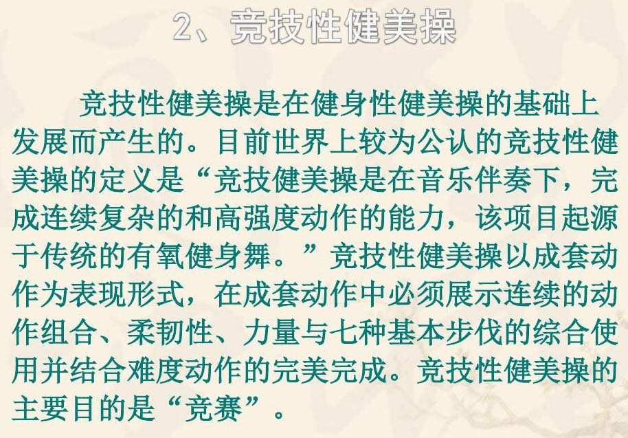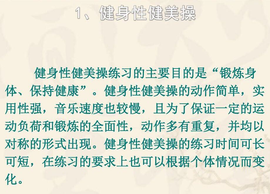 健美操是一项深受广大群众喜爱的、普及性极强的,集体操、舞蹈、音乐、健身、娱乐于一体的体育项目。