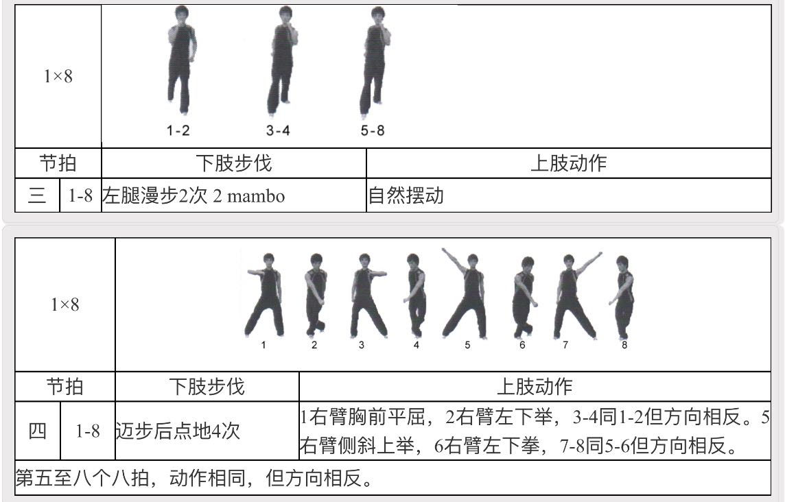 脚的动作:第1拍左脚向左侧迈一步,右脚在第2拍时向左脚后方点地,身体稍向右转,3拍右腿向右侧迈开一步,第4拍左脚向右脚后方交叉点地,5、6、7、8同1、2、3、4拍。