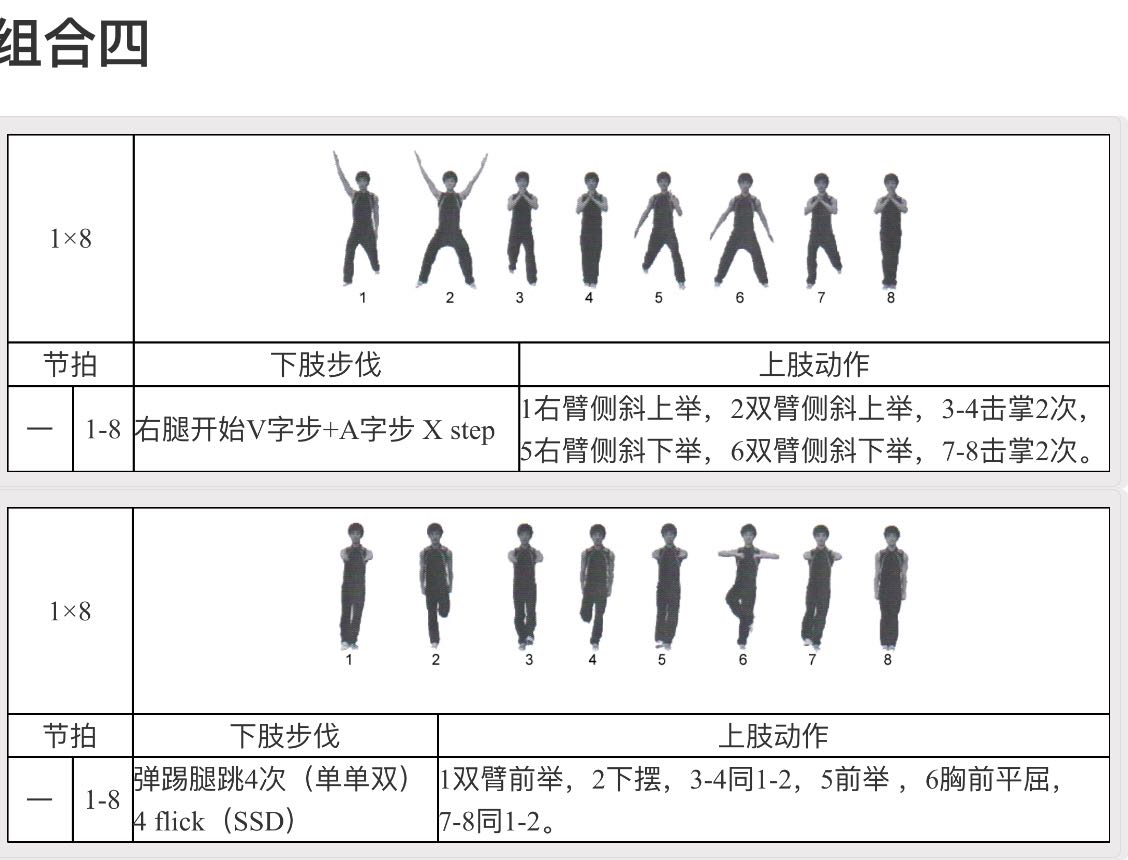 脚的动作:右脚开始弹踢腿,左右交换,第6拍时右腿屈膝抬腿与左脚膝盖前,7拍打开屈膝动作成踢腿动作,8拍收回。