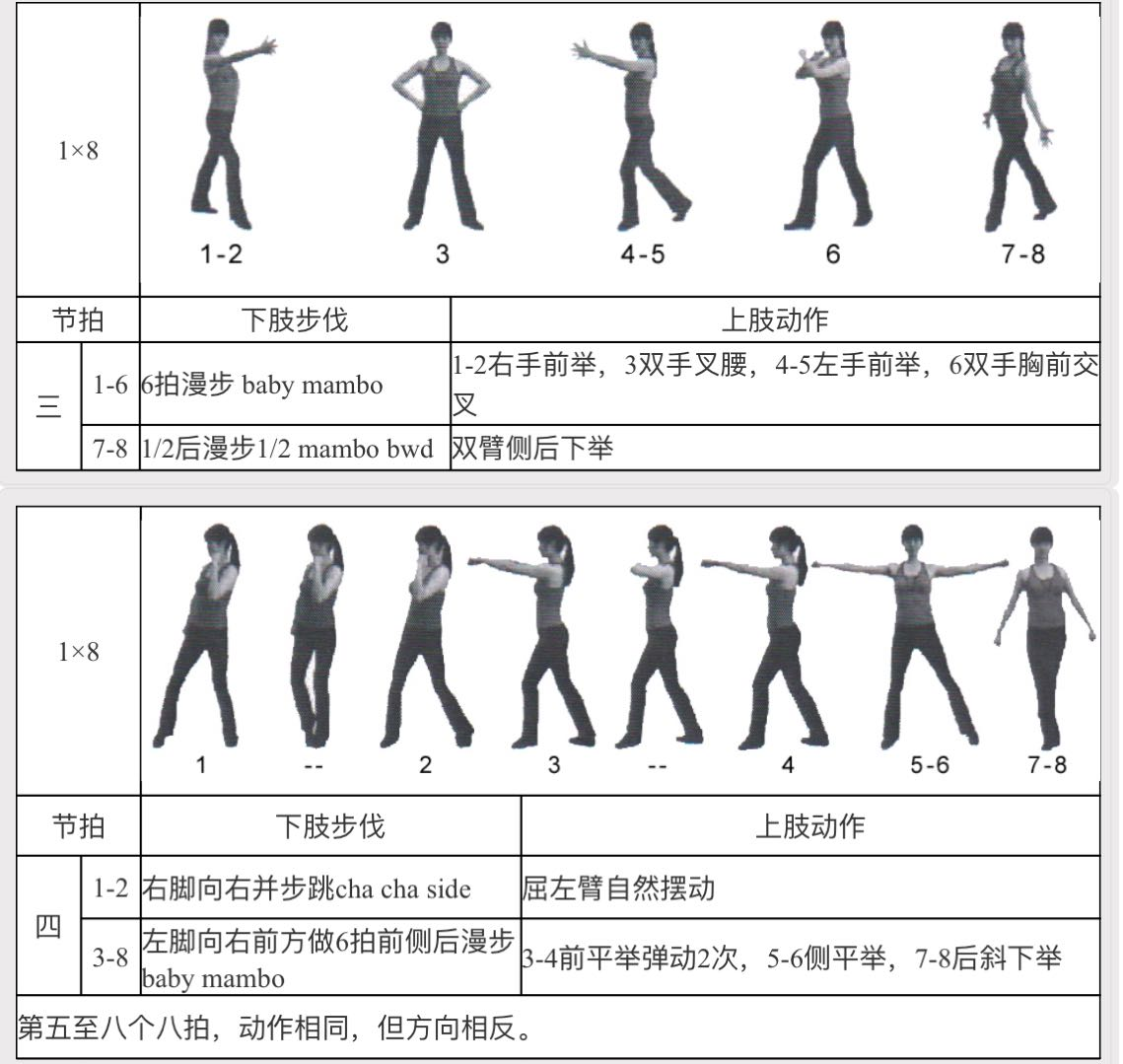 脚的动作:1-2右脚向右并步跳(恰恰),3-4左脚向前做半个漫步,5-6左脚向侧做半个漫步,7-8左脚向后做半个漫步。
