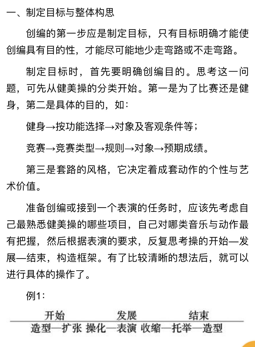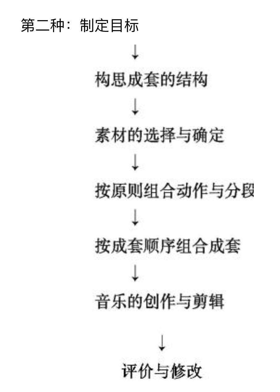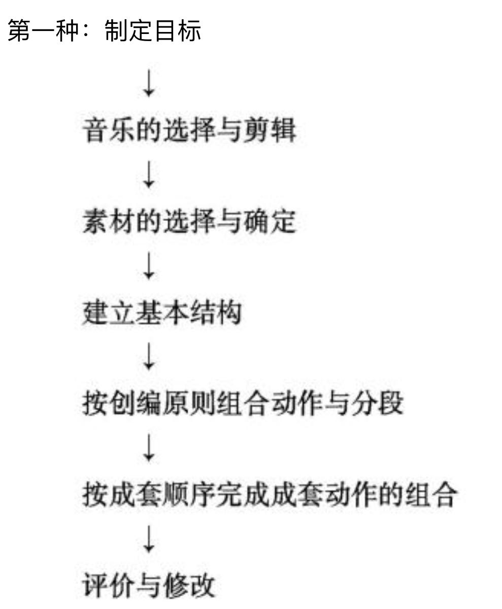 创编的过程是指创编健美操时的先后步骤与流程。有序地进行这些步骤,可以提高创作的效率及质量,也有利于我们对其结构及形式进行分析,以便下一步的修改工作。